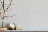Zdjęcie "Stylowa kompozycja we wnętrzu salonu z czarnym fortepianem, makieta na mapie plakatu, suszone kwiaty w wazonie, dekoracja i eleganckie akcesoria presonalne w nowoczesnym wystroju wnętrz." może być wykorzystywane do celów osobistych i komercyjnych zgodnie z warunkami zakupionej licencji Royalty-free. Obraz jest dostępny do pobrania w jakości wysokiej rozdzielczości do 5760x3840.