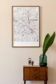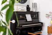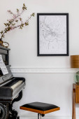 Stylowa kompozycja we wnętrzu salonu z czarnym fortepianem, makieta na mapie plakatu, suszone kwiaty w wazonie, dekoracja i eleganckie akcesoria presonalne w nowoczesnym wystroju wnętrz.