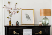 Zdjęcie "Stylowa kompozycja we wnętrzu salonu z czarnym fortepianem, makieta na mapie plakatu, suszone kwiaty w wazonie, dekoracja i eleganckie akcesoria presonalne w nowoczesnym wystroju wnętrz." może być wykorzystywane do celów osobistych i komercyjnych zgodnie z warunkami zakupionej licencji Royalty-free. Obraz jest dostępny do pobrania w jakości wysokiej rozdzielczości do 5760x3840.