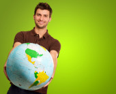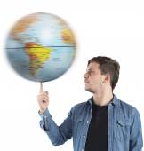 Przystojny nauczyciel w okularach uśmiechnięty do kamery trzymający kulę na białym tle