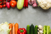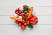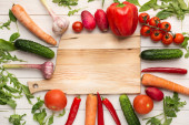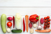 Różne surowe warzywa na białym drewnianym tle z pustą przestrzenią wokół. Cukinia, ogórek, pieprz chili, grzyby, pomidory, kalafior, sałata, marchew, seler, czosnek, rzodkiewki papryka