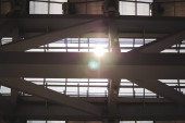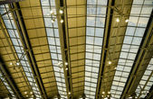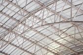 Abstrakcyjna architektura high-tech tło zdjęcie, Duża stalowa kratownica konstrukcji, ramy dachu i blachy stalowej w budowie placu budowy na lotnisku.