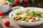 Zdrowa sałatka mieszana w białej misce na drewnianym stole.
