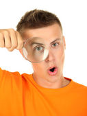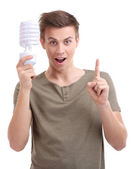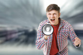 Portret młodego mężczyzny przystojnego krzyczącego za pomocą megafonu, odizolowanego na białym