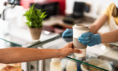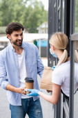 Widok człowieka trzymającego papierowe kubki i odbierającego paczkę od kelnerki w rękawiczkach lateksowych w pobliżu kawiarni