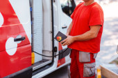 Zdjęcie "Pracownik w średnim wieku w czerwonym mundurze i kasku trzyma panel kontrolny do podnoszenia dźwigu i stoi obok vana. Ustawianie sygnalizacji świetlnej na ulicy w toku" może być wykorzystywane do celów osobistych i komercyjnych zgodnie z warunkami zakupionej licencji Royalty-free. Obraz jest dostępny do pobrania w jakości wysokiej rozdzielczości do 5760x3840.