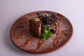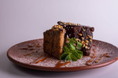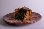 słodkie białe lody i maliny na drewnianym tle obok nich kawałek sernika