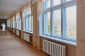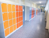 Szare metalowe przestarzałe szafki w pustym szkolnym korytarzu starej szkoły.