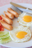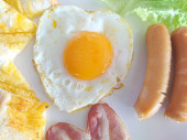 Angielskie śniadanie: smażone jajko, bekon, kiełbasa i tosty na talerzu z bliska. widok z góry