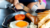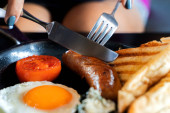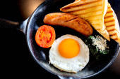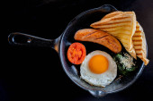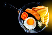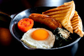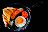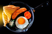Zdjęcie "Angielskie śniadanie: smażone jajko, bekon, kiełbasa i tosty na talerzu z bliska. widok z góry" może być wykorzystywane do celów osobistych i komercyjnych zgodnie z warunkami zakupionej licencji Royalty-free. Obraz jest dostępny do pobrania w jakości wysokiej rozdzielczości do 5760x3840.