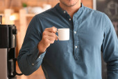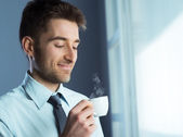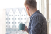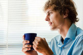 Przystojny młodzieniec pijący herbatę przy oknie w domu