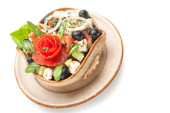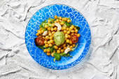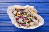 wysoki kąt widzenia płyty z esqueixada de bacalla, zimne danie wykonane z dorsza, pomidora, cebuli i czarnych oliwek, i ubrany w oliwę z oliwek, typowe dla Katalonii, Hiszpania, na niebieskiej powierzchni rustykalnej