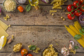 Zestaw różnych surowych makaronów i przypraw. Gotowanie włoskiej koncepcji makaronu ze świeżych ziół i warzyw. Styl rustykalny, drewniane tło