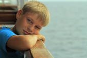 Portret zamyślonego chłopca, zbliżenie, opalenizna, wieczorne ujęcie.