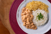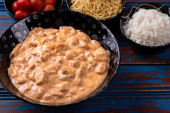 Stroganow z kurczaka z ryżem, sałatką i słomką ziemniaczaną.