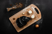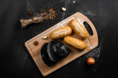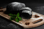 świeży czarny chleb żytni na desce do krojenia z przyprawami posypanymi mąką na czarnym drewnianym stole