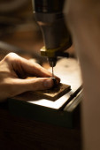 Warsztaty na temat drewna i kamienia, maszyny do pracy z drewnem, praca fizyczna, proces tworzenia. Ręce do pracy z drewnem, zbliżenie.