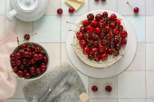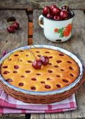 Tarta z dojrzałymi wiśniami i zieloną herbatą na brązowym tle. Domowy deser z dojrzałymi wiśniami