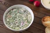 Rosyjska tradycyjna zimna zupa okroshka. Letnia zimna zupa z jogurtem i warzywami.