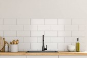 Zbliżenie do białej nowoczesnej kuchni z płytek kserokopiarka ściany, fartuch, naczynia do gotowania i croissant pieczone na czarnym blatu obok koszyka pełnego gazet