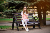 Fotografia pięknej dziewczyny spacerującej po mieście o zachodzie słońca w stylu casual z pięknymi włosami