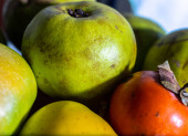 zielone jabłka w kroplach wody po deszczu są rozrzucone na czarnej metalowej tablicy, z wiklinowym koszem w tle na zielonej trawie