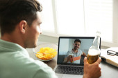 Przyjaciele mają video czat i piją razem piwo. Spotkanie online podczas kwarantanny koronawirusu