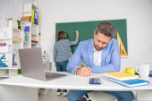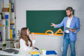 Zespół szkolny. student i korepetytor z laptopem. zdać egzamin. Pokój nauczycielski. studentka z nauczycielem na tablicy. Korepetytorka. starszy nauczyciel i kobieta na lekcjach szkolnych