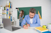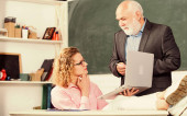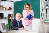 Zdjęcie "Zespół szkolny. student i korepetytor z laptopem. zdać egzamin. Pokój nauczycielski. studentka z nauczycielem na tablicy. Korepetytorka. starszy nauczyciel i kobieta na lekcjach szkolnych" może być wykorzystywane do celów osobistych i komercyjnych zgodnie z warunkami zakupionej licencji Royalty-free. Obraz jest dostępny do pobrania w jakości wysokiej rozdzielczości do 5760x3840.