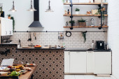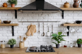 Widok z boku nowe meble, drewniany blat, kuchenka gazowa, wbudowany w sprzęt kuchenny, okap kuchenny, przybory kuchenne, roślina w doniczce w kuchni w apartamencie z nowoczesnym wnętrzem