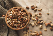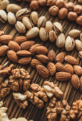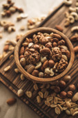 Różne rodzaje orzechów, mieszanka orzechów migdałów, orzechów laskowych, orzechów nerkowca, orzeszków ziemnych w drewnianej misce. Zamknij drzwi. Wysokiej jakości zdjęcie