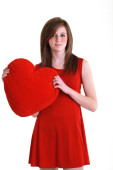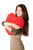miłość i Walentynki, ważąca czerwone serce. piękna brunetka kobieta w miłości.