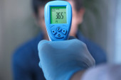 Ręka lekarza w rękawicy ochronnej posiada termometr podczerwieni i mierzy temperaturę pacjenta. Zdalny pomiar wysokiej gorączki u pacjenta z koronowirusem podczas pandemii.