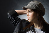 Piękna modna kobieta w jasnym płaszczu przeciwdeszczowym i bandana pozuje na jasnym tle.