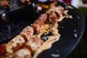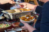 Szef kuchni serwuje gościom potrawy - mięso i warzywa w talerzu. Grill w ogrodzie