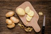 Surowe krojone ziemniaki w plasterkach, stos ziemniaków i nóż na wiejskim drewnianym stole.