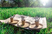 zestawy jednorazowych biodegradowalnych zastaw stołowych w naturze. biodegradowalne talerze i kieliszki wykonane z papieru i łyżek, widelców i noży z drewna. Ekologiczny nowoczesny zamiennik tworzyw sztucznych