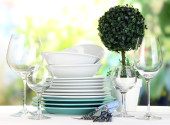 czysta dania na stole na tle okna