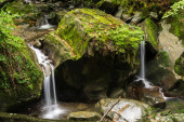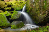 Zdjęcie "Mały wodospad na górskiej rzece. Długa ekspozycja wody. Zielony kolor. Kamienie i skały, z których spada woda. Charakter Ukrainy i Zakarpacia. Czas wolny i podróże. Rzeka. Piękne zdjęcie" może być wykorzystywane do celów osobistych i komercyjnych zgodnie z warunkami zakupionej licencji Royalty-free. Obraz jest dostępny do pobrania w jakości wysokiej rozdzielczości do 5760x3840.