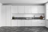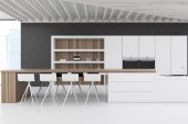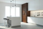 Wnętrze stylowej kuchni z szarymi ceglanymi ścianami, drewnianą podłogą, białymi szafkami i szafkami. Schody i zamazany pejzaż miasta. 3d renderowanie
