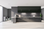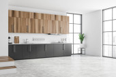 Zdjęcie "Wnętrze stylowej kuchni z szarymi ceglanymi ścianami, drewnianą podłogą, białymi szafkami i szafkami. Schody i zamazany pejzaż miasta. 3d renderowanie" może być wykorzystywane do celów osobistych i komercyjnych zgodnie z warunkami zakupionej licencji Royalty-free. Obraz jest dostępny do pobrania w jakości wysokiej rozdzielczości do 5760x3840.