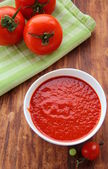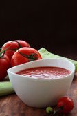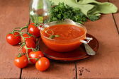 zupa pomidorowa z świeżych warzyw i kaparami w misce szkła