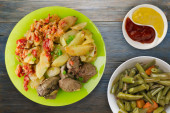 Zdjęcie " Smażona wątroba z ziemniakami i duszone pomidory z widelcem i widokiem z góry noża. smażona wątroba na talerzu na drewnianym tle" może być wykorzystywane do celów osobistych i komercyjnych zgodnie z warunkami zakupionej licencji Royalty-free. Obraz jest dostępny do pobrania w jakości wysokiej rozdzielczości do 5760x3840.
