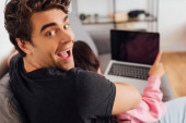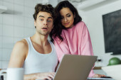 Selektywne skupienie uśmiechniętej pary patrzącej na kamerę przy laptopie, notebooku i filiżance kawy na kuchennym stole