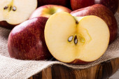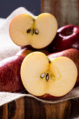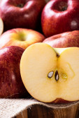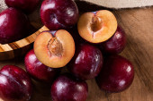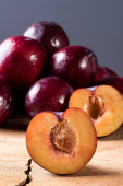 Śliwka przecięta na pół z kilkoma śliwkami w tle. Tło drewna.