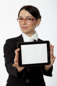 młody na białym tle biznes kobieta wyświetlone tabletki