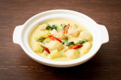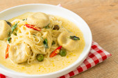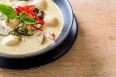 zielona zupa curry z mieloną wieprzowiną i kulą mięsną w misce - azjatycki styl jedzenia