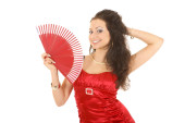 piękna dziewczyna Azji w czarny kapelusz z wentylatorem