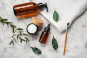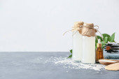 Zdrowa woda ryżowa z dodatkami kosmetycznymi na stole