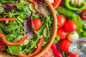 Zdjęcie "Świeża sałatka z rzodkiewką, ogórkiem, kolorowe pomidory wiśniowe. Najlepsze dla BBQ. Widok z góry." może być wykorzystywane do celów osobistych i komercyjnych zgodnie z warunkami zakupionej licencji Royalty-free. Obraz jest dostępny do pobrania w jakości wysokiej rozdzielczości do 5760x3840.